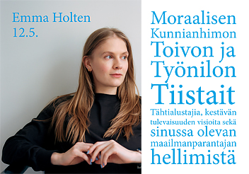 Helli sisäistä maailmanparantajaasi: Moraalisen Kunnianhimon, Toivon & Työnilon Tiistait tarjoilevat tähtialustajia, hyviä uutisia kentältä sekä arvostavaa katsetta Toivon Iltateen äärellä. Ole mukana paikan päällä tai EtäOlohuoneessa yhteisösi kanssa! Kevään tähtivieraana Kuluerä -bestsellerin Emma Holten (Tanska).
